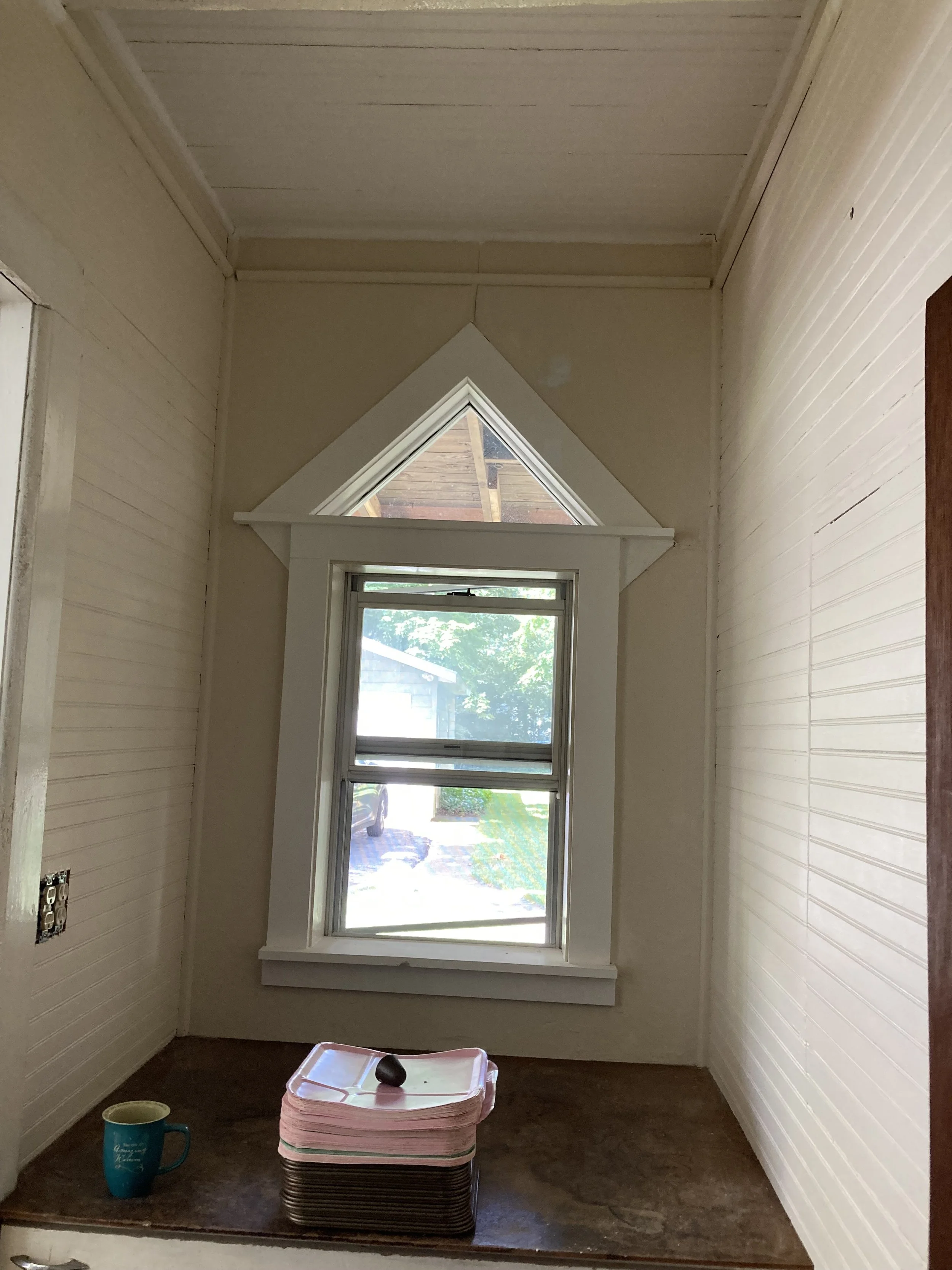 Here is a picture of a pantry, before and after painting. There’s a deep counter under the window, so cleaning and painting those areas was nearly impossible for this person with back pain. There is also a built-in set of shelves here, too, and hooks and brackets for wall storage. PWJ emptied the space first and washed the walls. With the textured walls, we used a brush, not roller, for the whole project. The window got a special coat of white paint, and the hardware got put back as needed. The fresh coat of paint in all the hard-to-reach spaces helped bring this small space out of some history and ready for new systems of storage.